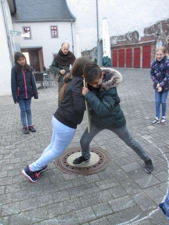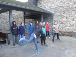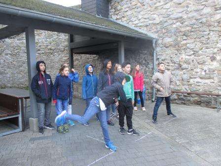Am Montag den 24. April trafen wir uns um 8.45 Uhr auf dem Parkplatz der Peter-Häring-Halle und sind um 9.00 Uhr mit dem Bus nach Diez gefahren. Nach der Ankunft in der Jugendherberge Diez versammelten wir uns Alle auf dem großen Hof der Jugendherberge und der Herbergsvater hat uns einiges über das Grafenschloss erklärt. Danach machten wir eine Stadtrallye durch Diez. Im Anschluss an die Stadtrallye gab es Mittagessen, eigentlich wollten wir dann auf unsere Zimmer gehen und schon mal die Betten beziehen. Da sie aber noch nicht fertig waren mit dem Reinigen der Zimmer, sind wir früher ins Museum gegangen. Dort machten wir ein Quiz, wir durften die Sträflingskleidung von früher anziehen und auch die Arbeit der Sträflinge machen. Das Meißeln von Steinen war interessant. Nach der Sträflingsarbeit sind wir auf unsere Zimmer gegangen und haben die Betten bezogen. Dann gab es Abendessen und wir durften zurück in unsere Zimmer.