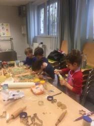 Schon Anfang November sorgten die 14 Kinder der Klasse 1a für adventlichen Duft im ganzen Schulhaus, denn an diesem Freitagmorgen war in der Schulküche Plätzchen backen mit den Eltern angesagt, und das blieb auch bald den anderen Klassen in den Etagen darüber nicht verborgen. Viele fleißige Mütter hatten alles mitgebracht, was man an Teig und an Material zum Ausstechen, Backen und Verzieren von Weihnachtsplätzchen so alles braucht.