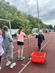 Das Sportfest am Freitag, den 23.05.2025 war ein voller Erfolg! Bei durchwachsenem Wetter- dafür aber bester Laune konnten die Kinder in altersgemischten Gruppen ihre Fähigkeiten in sieben aufregenden Disziplinen unter Beweis stellen.