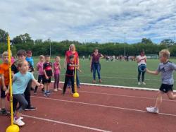 Nach dreijähriger coronabedingter Pause konnten wir zum erstem Mal seit 2019 wieder unser beliebtes Vielseitigkeitssportfest anbieten! Auch das Wetter spielte zum Glück wieder mit, und so konnten sich alle Kinder in altersgemischten Riegen in den vorher gut geübten 7 Disziplinen versuchen.