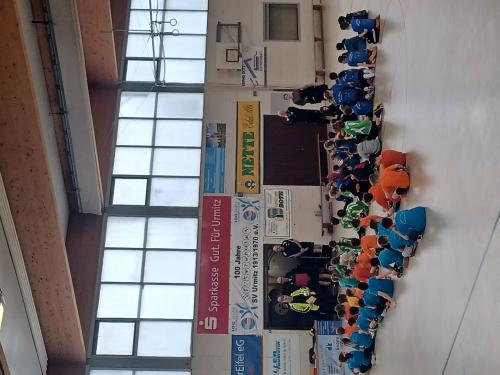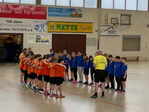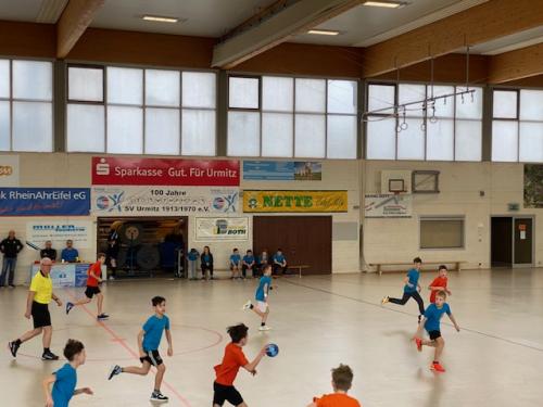 Im entscheidenden Spiel gab es ein 6:6 gegen die starken Mendiger, die somit durch das bessere Torverhältnis das bessere Ende für sich hatten und das Turnier gewannen. Es waren spannende, intensive und faire Spiele, bei denen echte Werbung für den Handballsport gemacht wurde. Zu den tollen sportlichen Leistungen passte auch das hervorragende Publikum – alle Schulklassen der Urmitzer Grundschule kamen im Laufe des Vormittags in die Halle und feuerten auf der Tribüne ihr Team mit Sprechchören und Plakaten lautstark an! Für leckere Speisen und Getränke hatte der Förderverein der Schule gesorgt und konnte dadurch wieder erfreuliche Einnahmen für die Unterstützung von Schulprojekten verzeichnen. Unser Dank geht an alle Kinder für Ihren Einsatz als Sportler oder Fans ebenso wie an alle aktiven Eltern – ob als Trainer, Zeitnehmer oder als Standbesetzung am Verkaufsstand und natürlich auch an alle Kuchenspender aus der Elternschaft!