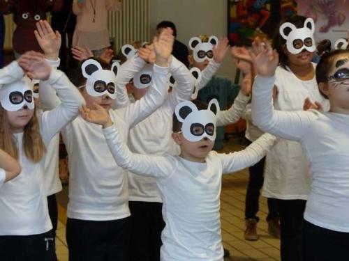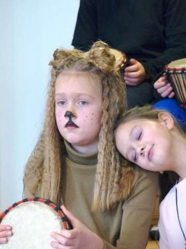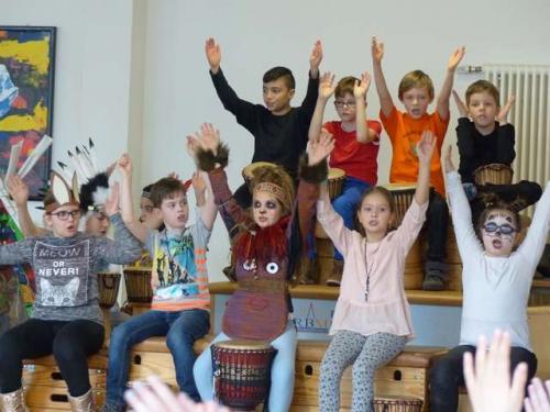 Alle durften sich am Schuleingang eine Trommel abholen, und schon auf dem Weg zur Aula hörte man fröhliche, laute und noch mehr oder weniger rhythmische Trommelgeräusche. Als alle ihren Platz gefunden hatten, ging es dann ohne große Vorreden los. Die Projektleiter Mario und Cris Argandona aus Köln zeigten ihnen zunächst einfache, dann auch zunehmend anspruchsvollere Trommelrhythmen und dazu passende Bewegungen. Die Kinder machten alles mit großer Freude nach und lernten so an den ersten 3 Tagen die Rhythmen, Texte und Melodien zu den Liedern, mit denen sie "Trommelinho" auf seiner Abenteuerreise durch die Welt begleiten durften. Dazu bastelten sie im Laufe der Woche mit ihren Lehrerinnen und Lehrern auch entsprechende Masken und Verkleidungen, um die Rollen von Pandas, Kängurus, Löwen, Wolken oder Cherokee-Indianern zu schlüpfen und verschönerten einen bunten Sonnenschirm, der die "Trommelinhoflugmaschine" auf der Weltreise darstellte. Während Mario mit den Kindern die Lieder und Tänze einstudierte, sorgte sein Sohn Cris jeweils für den richtigen Sound dazu oder er trainierte mit den Hauptdarstellern in einem separaten Raum deren Sprechrollen und zeichnete sie für die Vorstellung auf. Beide fanden von Beginn an einen tollen Kontakt zu den Kindern, sie zeigten sich stets gut gelaunt, geduldig und witzig und schafften es mit ihrer authentischen und motivierenden Art hervorragend, auch etwas zurückhaltendere Kinder aus der Reserve zu locken und sie zu überzeugenden Trommlern und Darstellern werden zu lassen. Dabei ging es ihnen nicht nur um die Freude am Musizieren und einen Lernzuwachs im musisch-künsterlischen Bereich. Den Kindern soll in ihren Stücken auch Offenheit und Toleranz vermittelt werden, ihr Interesse an anderen Kulturen soll geweckt und nicht zuletzt auch ein gestärktes Selbstbewusstsein geschaffen werden durch die Erkenntnis, dass man schon in kurzer Zeit so viel neues lernen und umsetzen kann. Nach 3 Tagen Vorbereitung und einer Generalprobe war es dann soweit: Im Foyer der Sporthalle waren Eltern, Großeltern, Geschwisterkinder und viele weitere Gäste am Freitagnachmittag zum Abschluss der Woche zur großen Aufführung des Stücks "Trommelinho und der Sonnenmondstaub" eingeladen und ebenfalls davon begeistert, was die Kinder in wenigen Tagen gelernt hatten und nun auf die Bühne brachten! Höhepunkt des Stückes war die Szene, als Sonnen- und Mondkind den "Sonnenmondstaub" in Form von Konfetti über die staunenden Kindern verstreuten. Alle Zuschauer waren sich mit Kindern und Lehrerteam einig, dass diese Projektwoche ein voller Erfolgt war und den frischgebackenen "Trommelhelden" als einer der Höhepunkte ihrer Grundschulzeit in bester Erinnerung bleiben wird! Schulleiter Thomas Rauch dankte am Ende den Kindern für ihren tollen Auftritt, dem Lehrerteam für die intensiven Vorbereitungen, den beiden Trommellehrern für die hervorragende Arbeit und nicht zuletzt natürlich dem Förderverein der Schule, der sämtliche Kosten für das Projekt übernommen und die Durchführung dadurch erst möglich gemacht hatte!