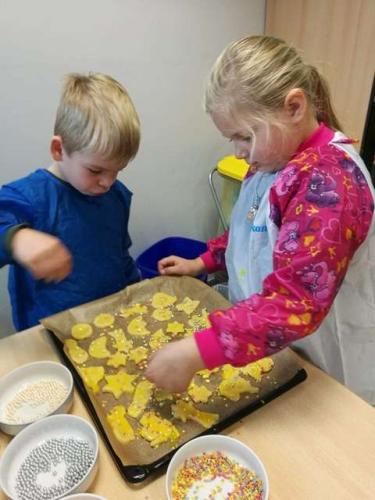 Die Kinder waren mit Feuereifer bei der Sache, zeigten viel Ausdauer und Geschick beim Verschönern der fertigen Plätzchen und hatten alle riesigen Spaß bei der ersten gemeinsamen Aktion in unserer Schulküche. Am Ende des Vormittags waren alle ganz stolz auf die leckeren Ergebnisse, die erst einmal in mehreren schönen Dosen in der Klasse aufbewahrt wurden und dann bald zum Naschen bereit stehen werden.