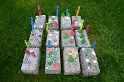 Zunächst erklärte uns Herr Zimmer die verschiedenen Phasen des Ausbruchs des Laacher See-Vulkans und damit den Ursprung des Bimsgesteins. Anschließend zeigte er uns, wie die Mischung zur Herstellung eines Bimssteins angerührt und ein Stein in Handarbeit hergestellt wird. Nun durften alle Kinder selbst nach der vorgegebenen Rezeptur ihr Bimsgemisch anrühren und ihren ersten Bimsstein mithilfe einer Holzform herstellen. Wichtig war dabei, das Gemisch durch Pressen und Klopfen gut zu verdichten. Nach Belieben konnte dann jeder seinen Stein mit Muscheln, Glas- Nuggets oder hölzernen Dekoartikeln kreativ verzieren. Zum Aushärten stellten wir dann die Brettchen mit den Formen in ein Regal. Bei dem nun folgenden Rundgang durch das Museum verdeutlichte uns Herr Zimmer die Entwicklung der Bimssteinproduktion von der Handschlagmaschine bis hin zur maschinellen Herstellung. Kurze Filmsequenzen unterstützten dabei unser Vorstellungsvermögen. Es bereitete den Kindern auch viel Spaß, dass sie kurz im Schaufelbagger, der Raupe und dem Transport- LKW für Bimssteine Platz nehmen durften und sich so in die jeweilige Arbeit hineinversetzen konnten. Benno, der sprechende Bimsstein mit seinen stahlblauen Augen, fasste noch einmal die wichtigsten Punkte der Entstehung und des Wandels der Bimsindustrie zusammen, die für die Menschen im Neuwieder Becken von existentieller Bedeutung war und gleichzeitig viel zum Wandel vom Agrarland zur Industrieregion beigetragen hat. Die letzte der 36 Stationen war der Spielplatz des Bimsmuseums, wo alle mit vereinten Kräften den „Bimstruck“ mit „Steinen“ beluden. So ging ein sehr lehrreicher, interessanter, abwechslungsreicher und eindrucksvoller Vormittag zu Ende.